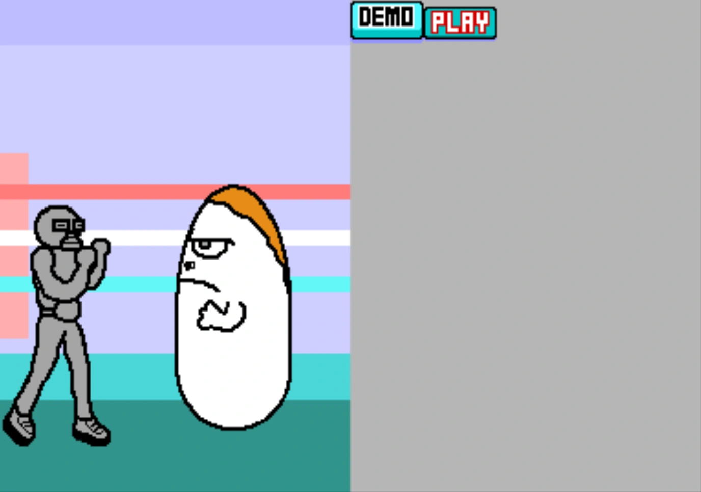 The player controls a boxer who is completely gray with muscular arms, square eyes, and a big belt, who punches a white bopper sandbag with orange hair, big eyes, short arms, and a constant frown. The two fight in an arena with a blue floor boxed in by red, white, and light blue boundaries.