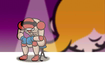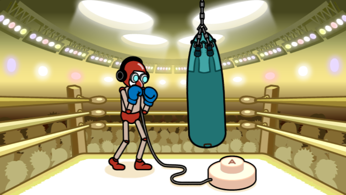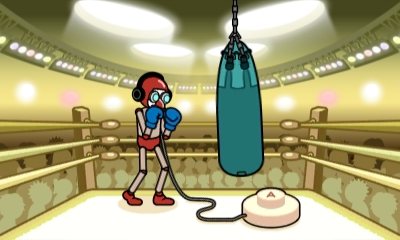 The only changes to the game's appearance are recolored things. The Muscle Doll himself is now tan with red clothes, the punching bag is blue, and the background is mostly tan/yellow. The base gameplay is the same, as the original; the player needs to puff up the doll as he punches to hit the bag, following the announcer's cues. However, the first part of the game has several cues for the player to make, while the screen is still black and partially darkened. This requires the player to not get caught off guard, and hit the beats without visuals. The game's cues are mostly consecutive offbeat as well.