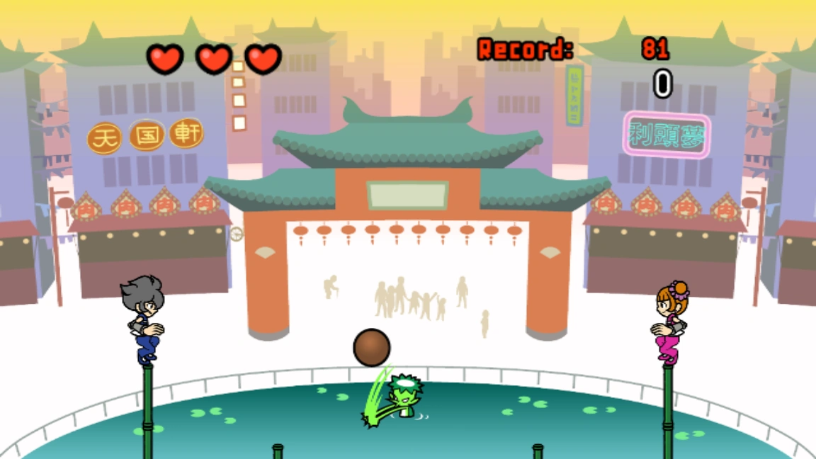 In this game, the two players control Young Cricket and Cicada, who are learning the ancient art of Kung Fu Ball. This involves them passing a stone ball from one to the other while balancing on bamboo sticks in the middle of a pool. The longer they keep up the act, the more people join to watch.