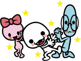 From the right: Cam, Marshal, and Miss Ribbon. Cam is quiet and looks like a thinker, but his mind is actually a blank slate. Marshal looks cute and can be relied upon. Miss Ribbon looks innocent but is really quite stubborn. Some think these guys are related to the Chorus Kids from the previous Rhythm Heaven.