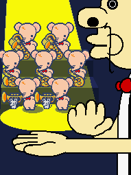 The long version, Munchy Monk, appears in the fourth stage of Rhythm Heaven and Comet Land in Rhythm Heaven Megamix.