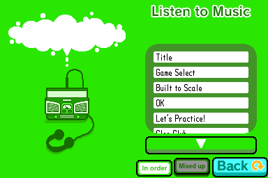 Upon first creating a save file, only Title and Game Select are available. The list includes the names used in Rhythm Heaven first, then the altered name used in Rhythm Paradise where applicable.
