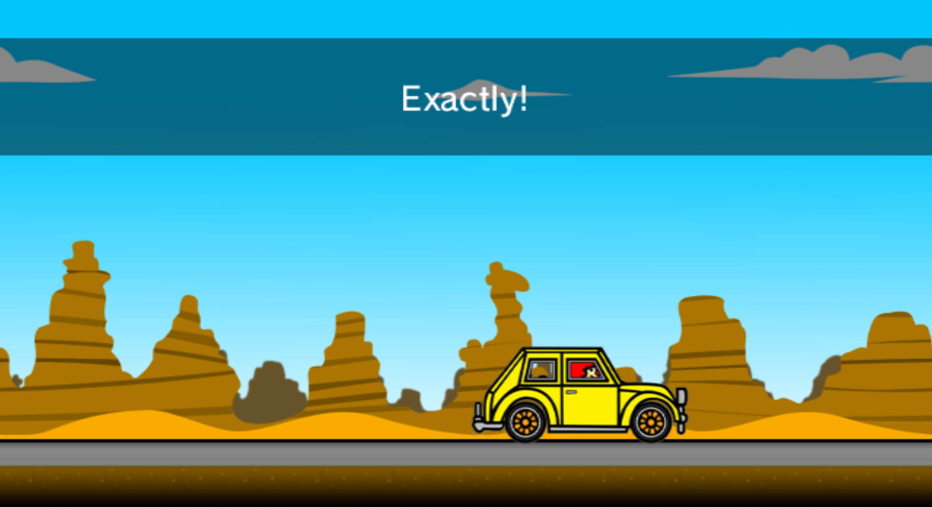Once the car is let go, the car speeds off depending on how long the player pulled it back, stopping ahead if it was too soon and past if it was too late. If the car lines up correctly, the game congratulates the player. The player has unlimited attempts to accomplish this and the game resets back to the beginning after each attempt, regardless of the outcome.