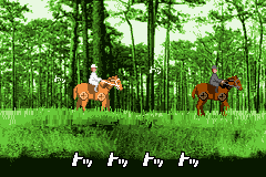 This machine has a rather simple look to it. Two people are riding horses in the middle of a forest. The player controls a man wearing white clothes and a white hat on a light brown horse machine. The other character is wearing darker colored clothing and has a much darker horse.